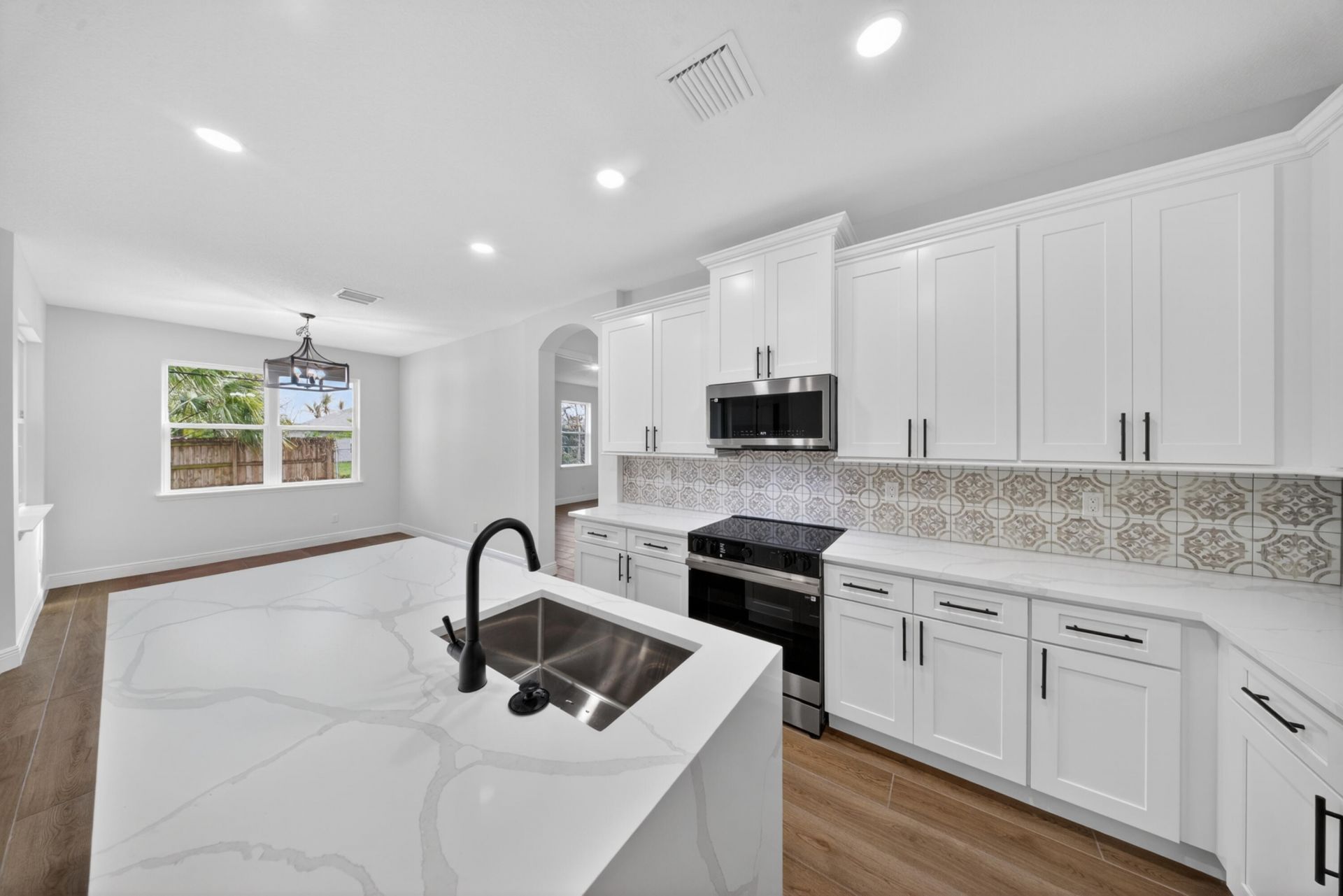 This 5 bedroom, 3 bath custom new construction home is our popular Shoreline model with some tweaks and loaded with upgrades. This home features IMPACT windows and doors, 8 foot doors, huge kitchen with quartz countertops, waterfall edge island, custom tile backsplash, oversized plank tile throughout the home, custom shower tile to the ceilings with pebble tile on the shower floor and frameless glass shower enclosure in the master. This home features 42 inch white shaker cabinets with soft close doors and drawers and also includes crown and light rail on the cabinets. This is the only shoreline model currently available in Port St Lucie. This home checks all the boxes and it is move in ready now and ready to close. Ask about our builder incentives! Move in ready new construction home. This home is ready to close. Ask about our builder incentives for closing costs, etc.