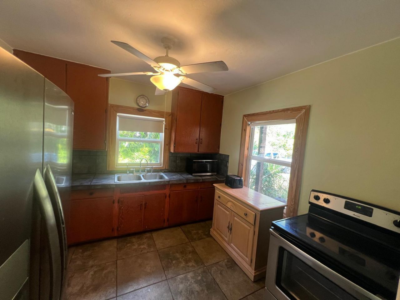 Real hardwood floors in living room, dining room, and 2 bedrooms, ceramic tile elsewhere. Both baths have been remodeled, showers, no tubs. Ceiling fans in every room. DSL/cable set up. Vaulted ceilings, attic storage. Small porch in front, 2 large patios in back and 25 x 30, one raised with steps on 3 sides. window treatments. Well to water plants/wash car. Surrounded by coconut and Sylvester palms, banana trees, avocado tree, 2 mango trees, olive and cherry bushes in front. Property surrounded by chain link fence. Room for a pool and second home.